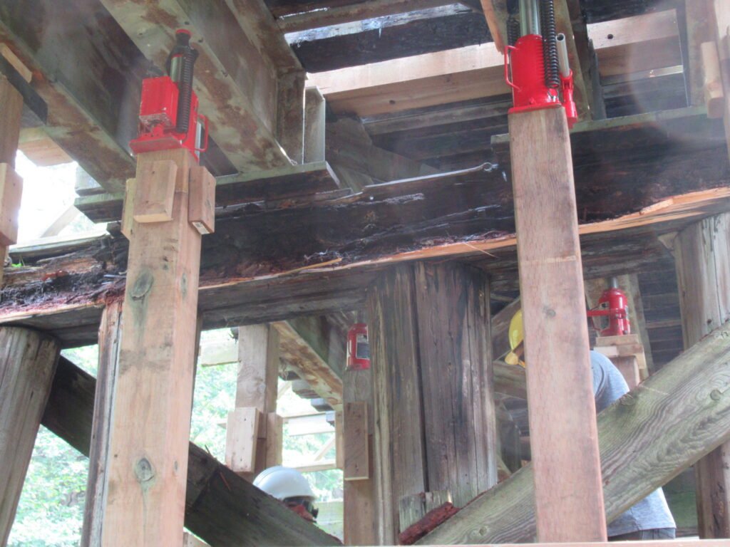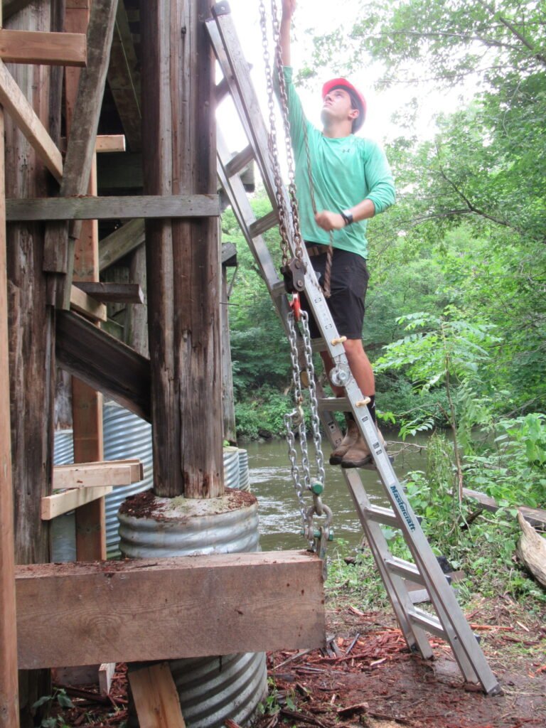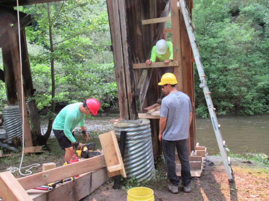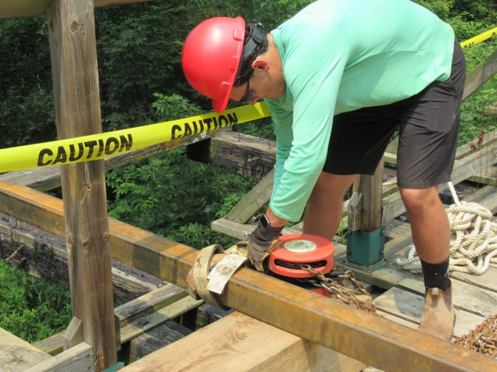 Gamble and his crew managed to jack up the bridge, remove the old beam and move the new beam into position on July 19th. The following day, the beam was aligned and secured in position, bridge handrails re-established and the work site was cleared of all equipment and material. LVT maintenance personnel also took advantage of the trail closure to install a number of new deck boards on the bridge.